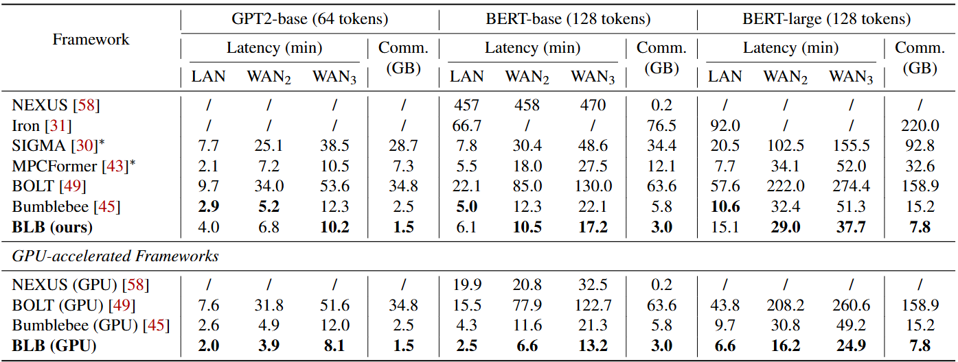 实验结果表明,在 BERT与 GPT2等Transformer-based模型上,BLB 相比 BOLT (S&P’24) 将通信量降低 21 倍,相比 Bumblebee (NDSS’25) 降低 2 倍;在 GPU 加速下,推理延迟最多可降低 13 倍。正如审稿人所评价的那样,BLB 的思想不仅适用于 Transformer,更能够推广到广泛的双方隐私计算任务场景,为未来大模型的隐私保护推理提供了全新的路径。